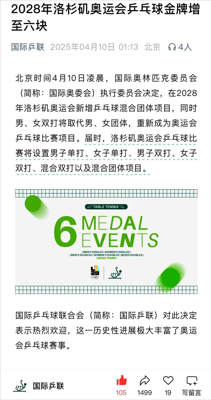 根据已公布的消息,洛杉矶奥运会将取消现有的男女团体赛,改为设置男女双打项目,并新增混合团体项目。