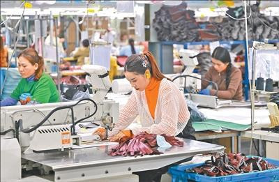 公司生产车间内,一片繁忙的景象:上百台缝纫机飞轮快速旋转,各色布料在员工指间翻飞。厂长赵忠穿梭其间,不时查看产品缝合工艺、指导操作细节。